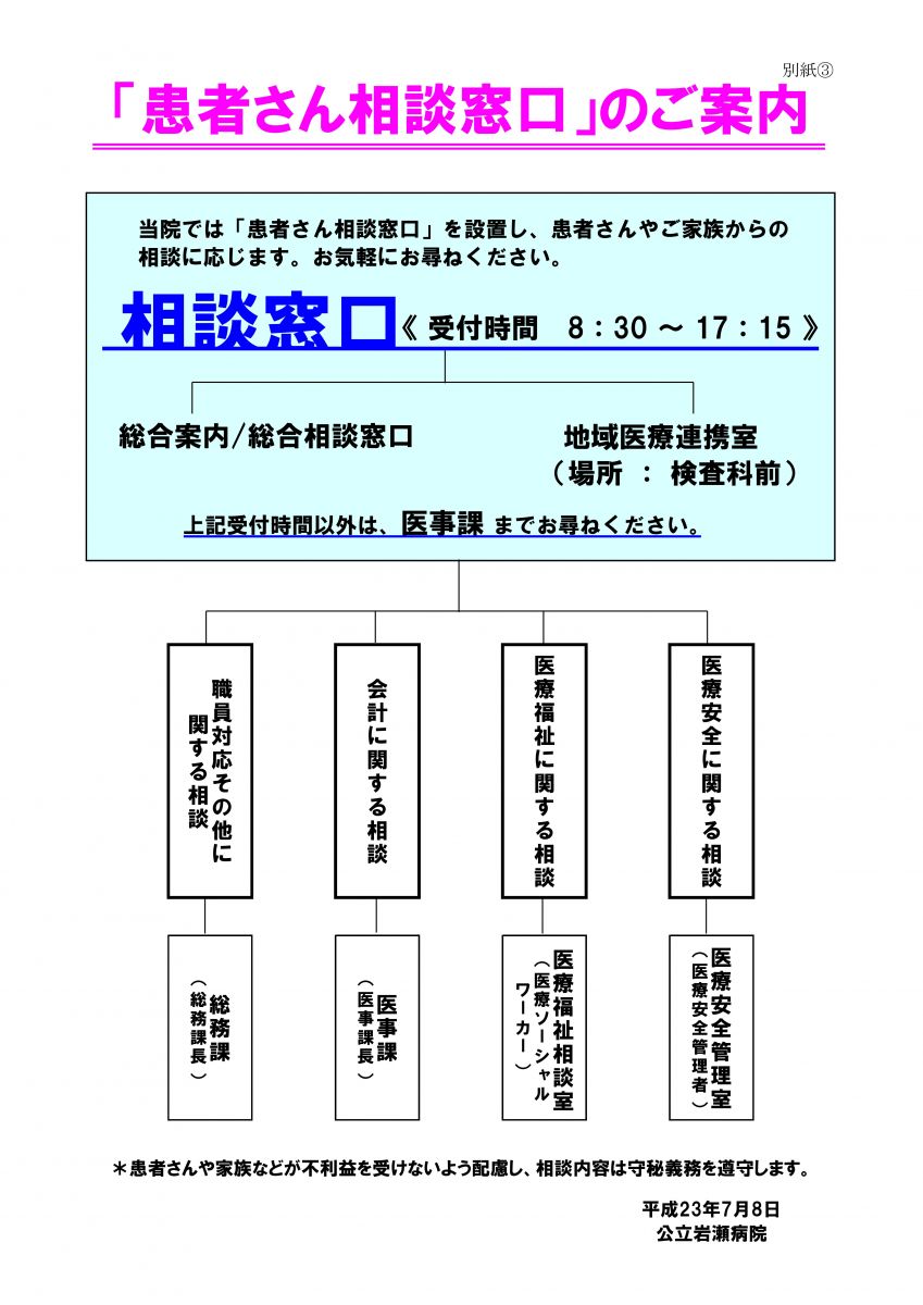 - 患者相談窓口」を設置して、患者さんからの相談に適切な対応を確保します。また、相談により患者さんやご家族等が不利益を受けないよう努めます。